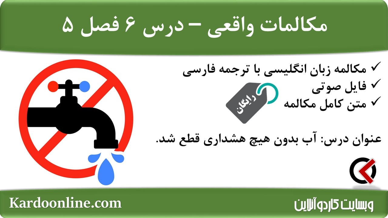 مکالمات واقعی زبان انگلیسی (آب و هوا): آب بدون هیچ هشداری قطع شد. در این مطلب از وبسایت کاردوآنلاین، یک درس دیگر با عنوان آب بدون هیچ هشداری قطع شد.