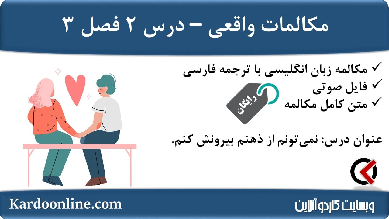 مکالمات واقعی زبان انگلیسی (عشق): نمیتونم از ذهنم بیرونش کنم. در این مطلب از وبسایت کاردوآنلاین، یک درس دیگر با عنوان نمیتونم از ذهنم بیرونش کنم. از مجموعه دروس مکالمات